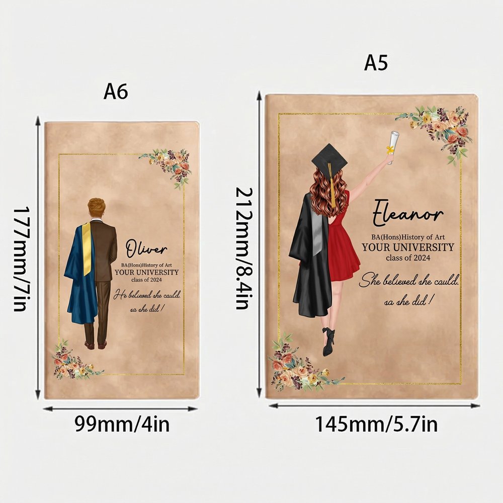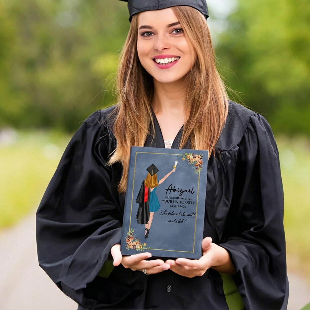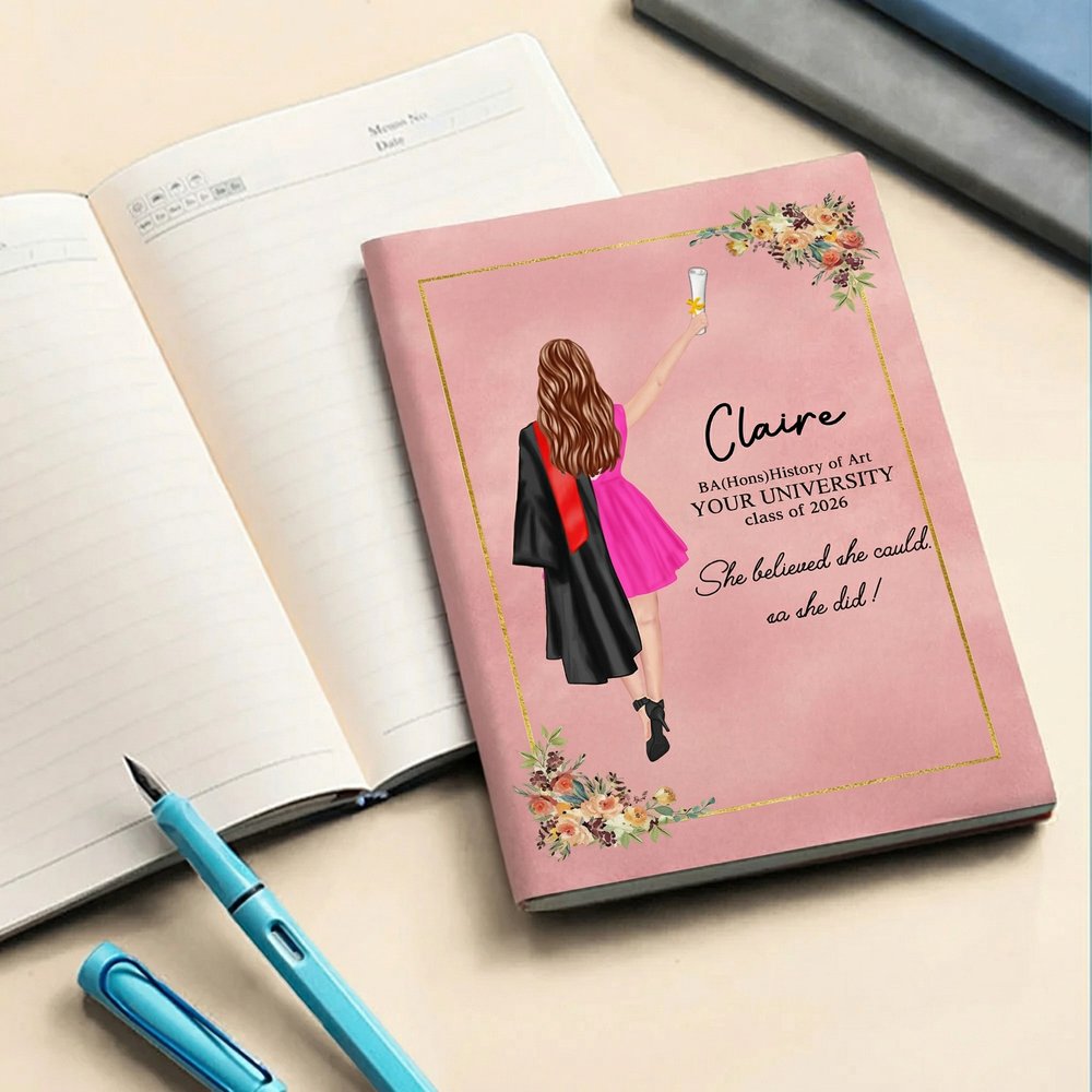 This graduation notebook features a customizable cover with a charming cartoon illustration of the graduate in a cap and gown, paired with delicate floral accents. You can personalize it with the graduate’s name, degree, university, graduation year, and an inspiring quote like “She believed she could, so she did!”, turning a simple journal into a unique, heartfelt tribute to their academic journey and milestone achievement.