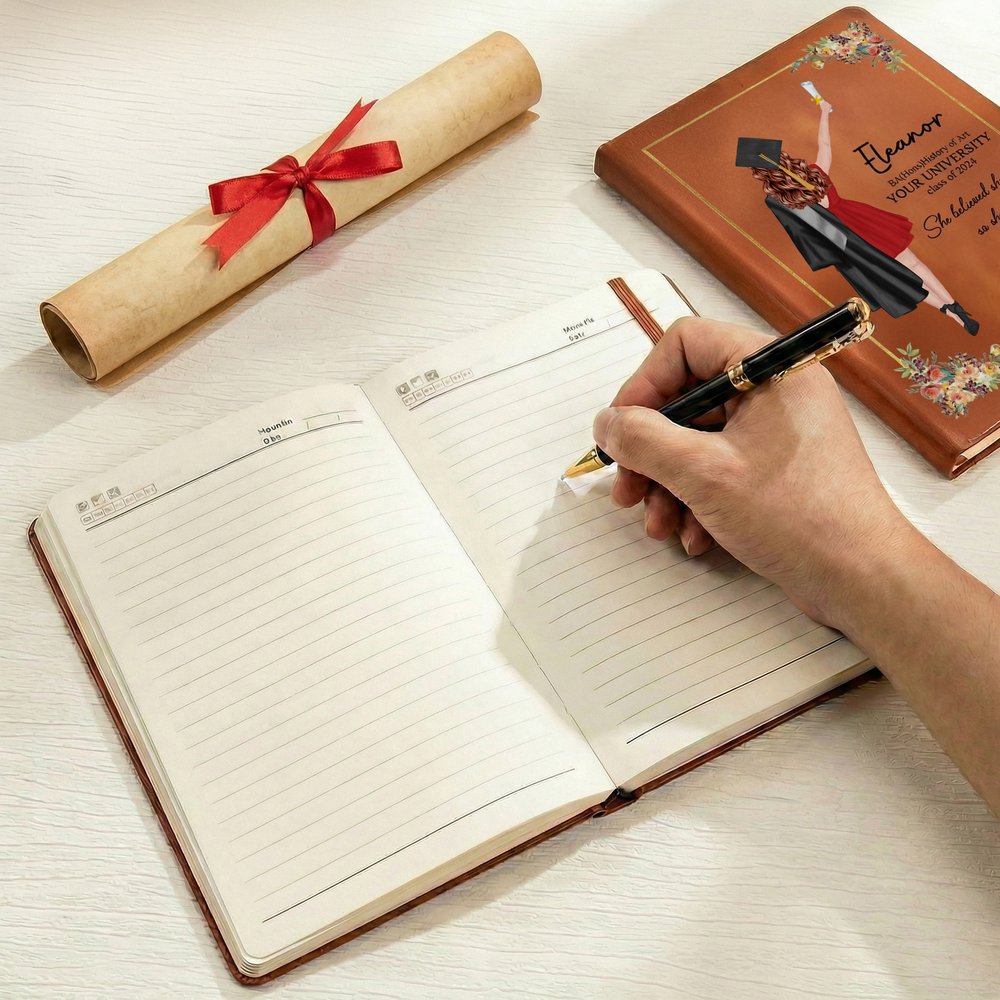 This personalized graduation notebook is the ideal gift for high school or college graduates, perfect for graduation ceremonies, graduation parties, or as a heartfelt congratulations present. It’s a meaningful choice for family, friends, or mentors to celebrate the graduate’s hard work and success, transforming a practical stationery item into a sentimental memento that honors their academic accomplishments.