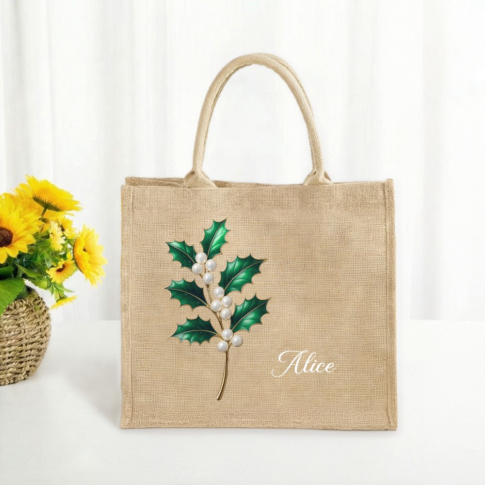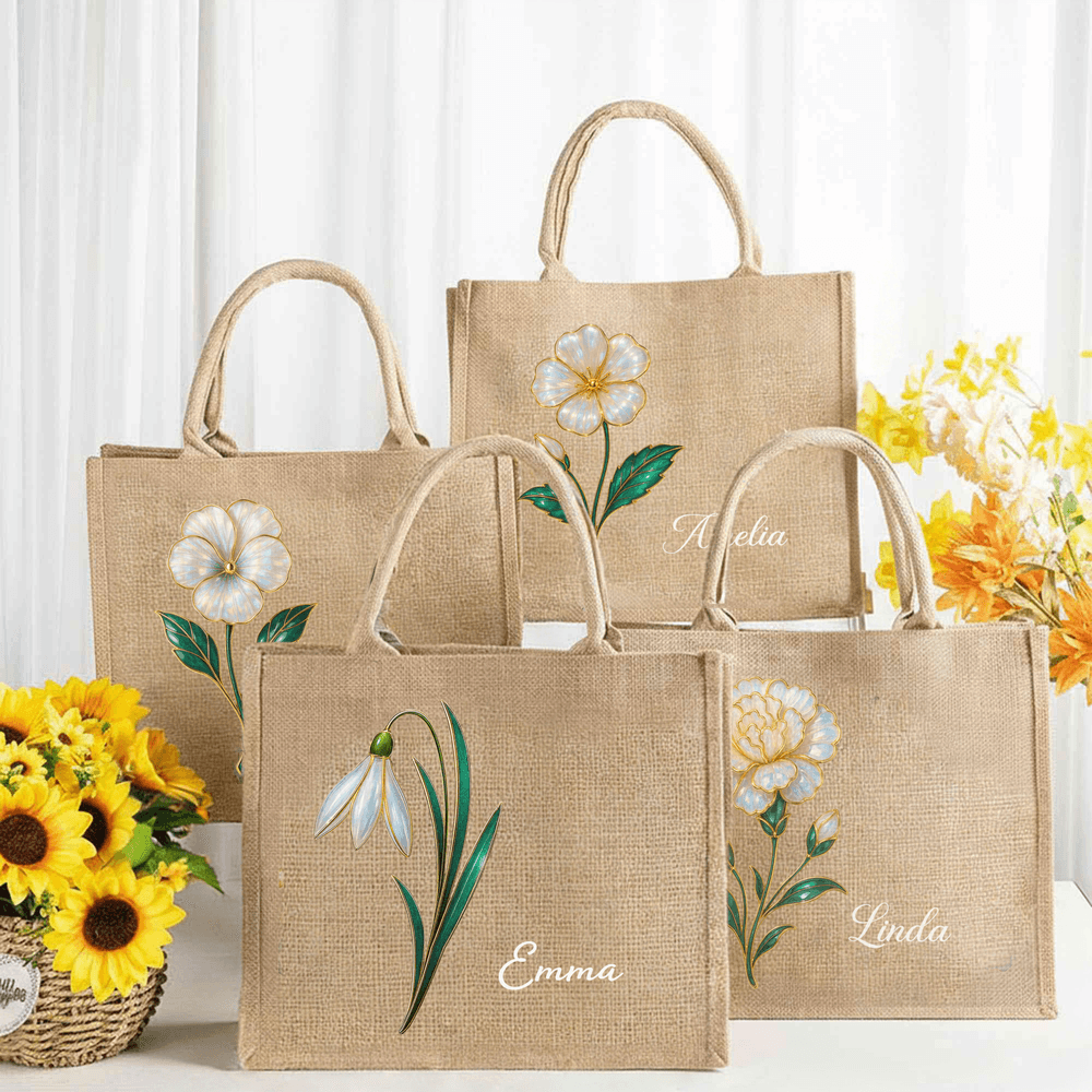 Personalized Pearl Effect Birth Flower Large Jute Tote Bag with Name Travel Essential Birthday Anniversary Gift for Women
